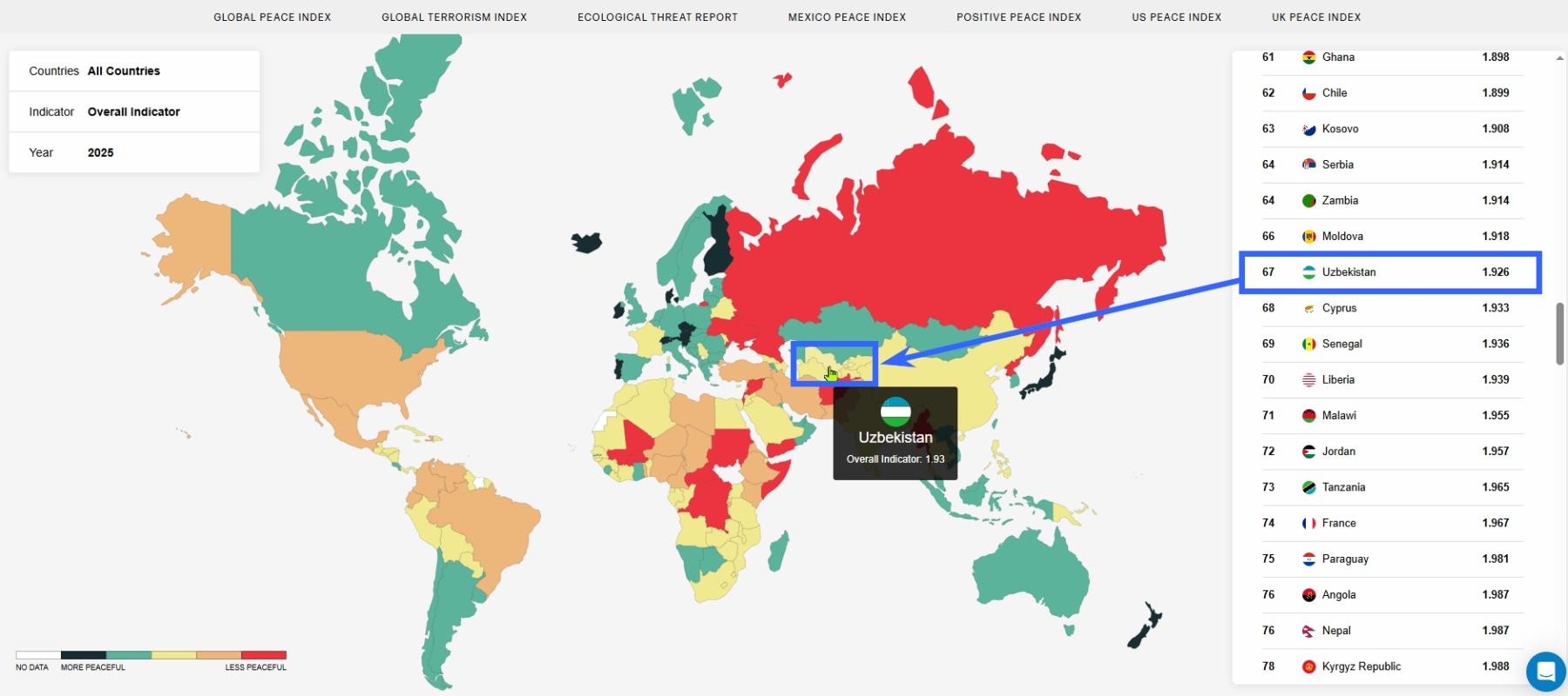 По данным последнего отчёта Global Peace Index (2025), Узбекистан занимает 67-е место из 163 стран с итоговым индексом 1.926, входя в топ-100 самых мирных государств мира. Этот результат отражает стабильную внутреннюю обстановку, низкий уровень вооружённых конфликтов и рост доверия к государственным институтам.